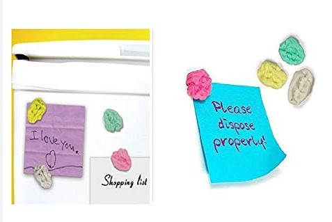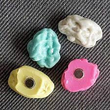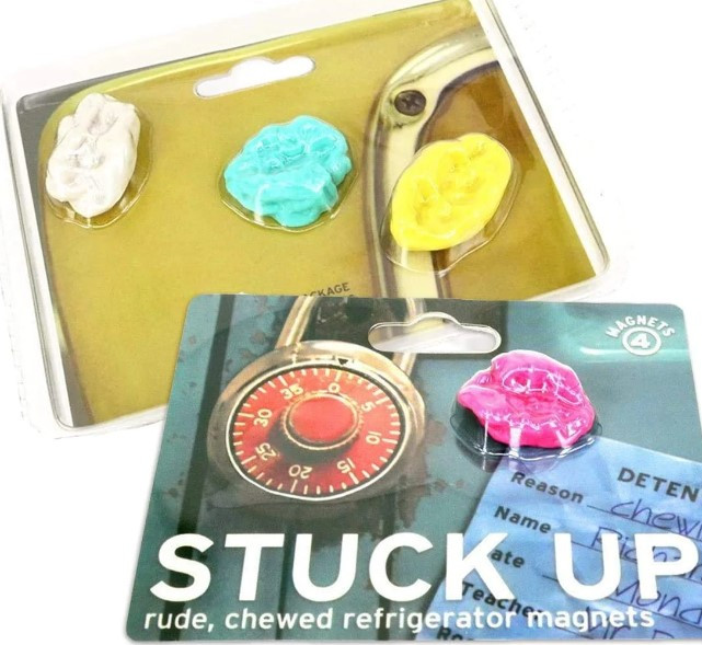 Conjunto de imanes para heladera simulando chicles masticados. 4 unidades de diferentes formas y colores.