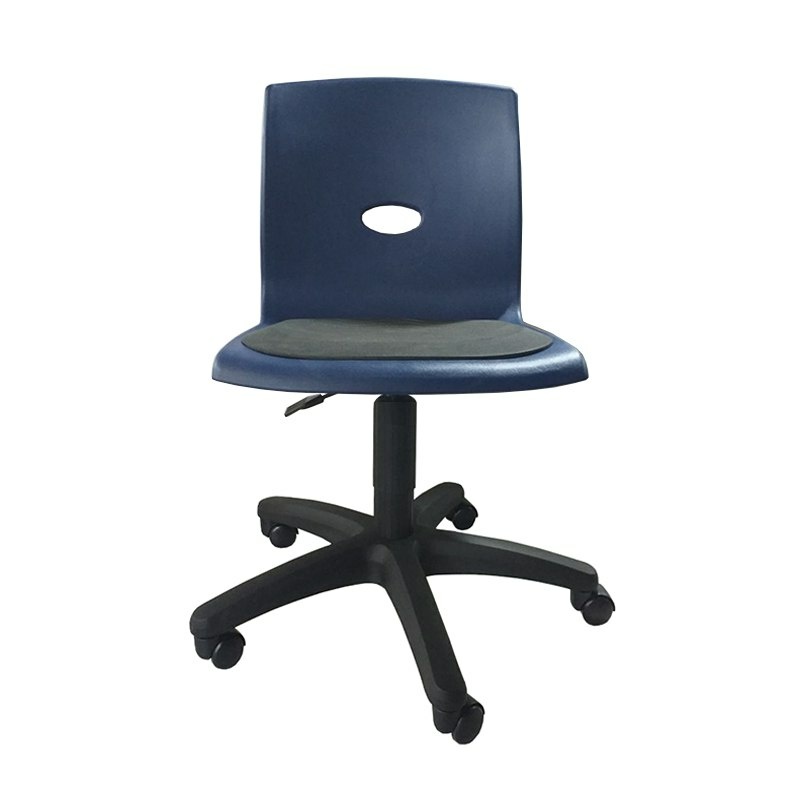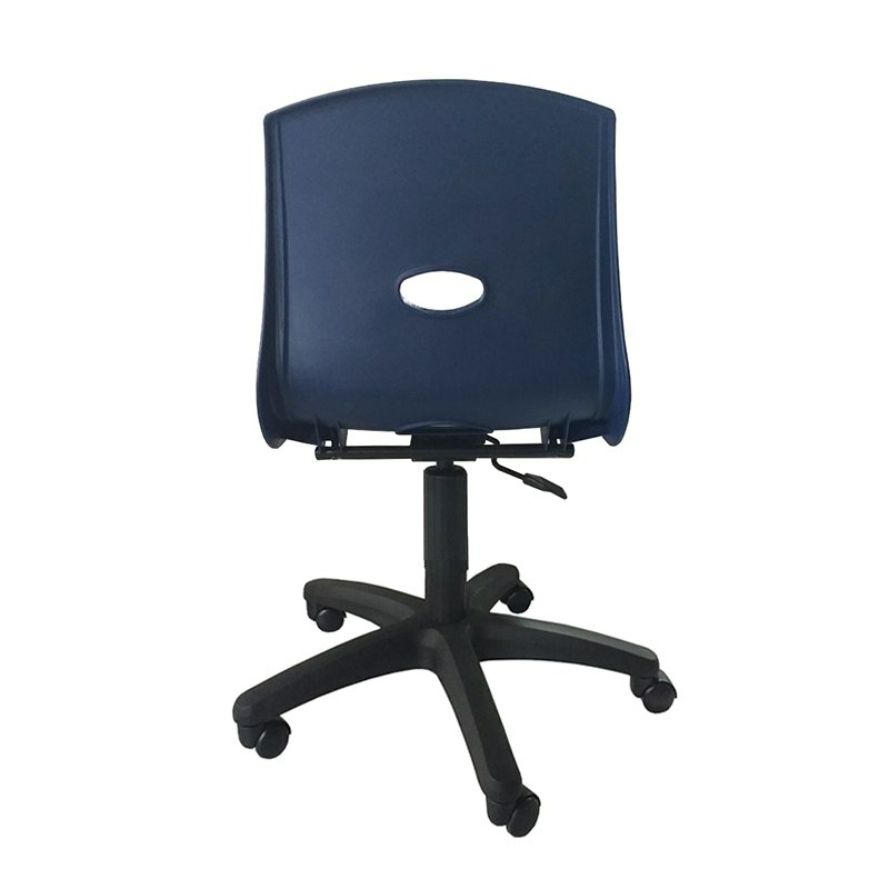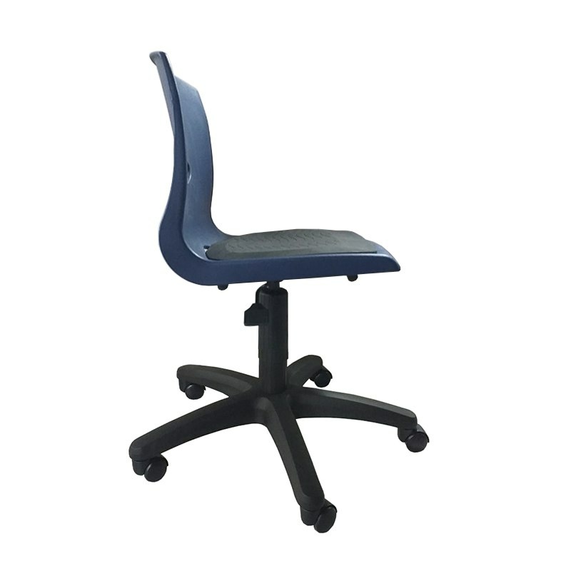 Silla ideal para Home Office. Robusta carcaza plastica color azul. Base giratoria de 5 radios en polipropileno reforzado con fibra de vidrio. 5 ruedas dobles. Cilindro a gas Clase A para regular altura.
