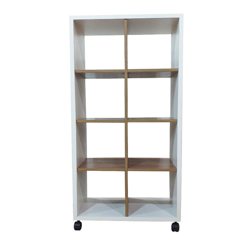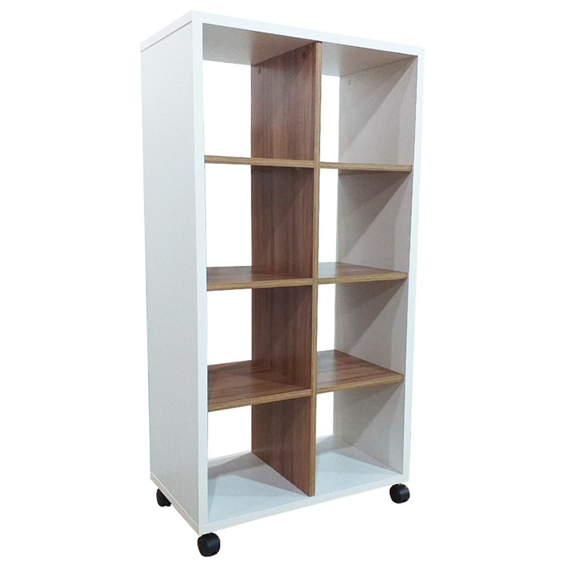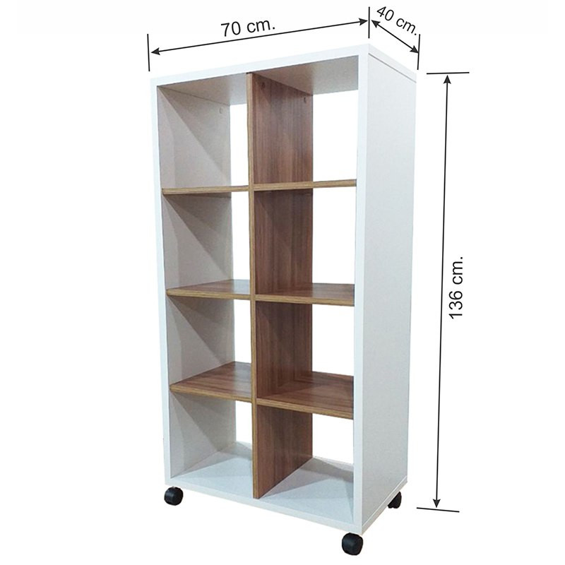 Biblioteca con ruedas. Piso, techo y laterales en aglomerado melaminico blanco de 25 mm. Cuadricula interior en aglomerado melaminico color nogal sevilha de 18 mm. 4 ruedas dobles. Med.: 70 cm de frente x 40 cm de prof. x 136 cm de altura total.