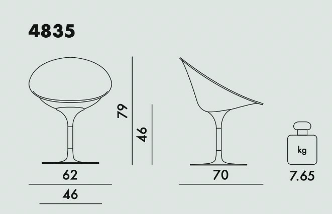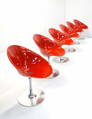 ERO/S/, envolvente y acogedora de forma ovalada, caracterizada por una refinada combinación de acabados y acertado uso del color. Estructura de policarbonato color Rojo, base de aluminio pulido. Diseño Philippe Starck para KARTELL. Made in Italy.