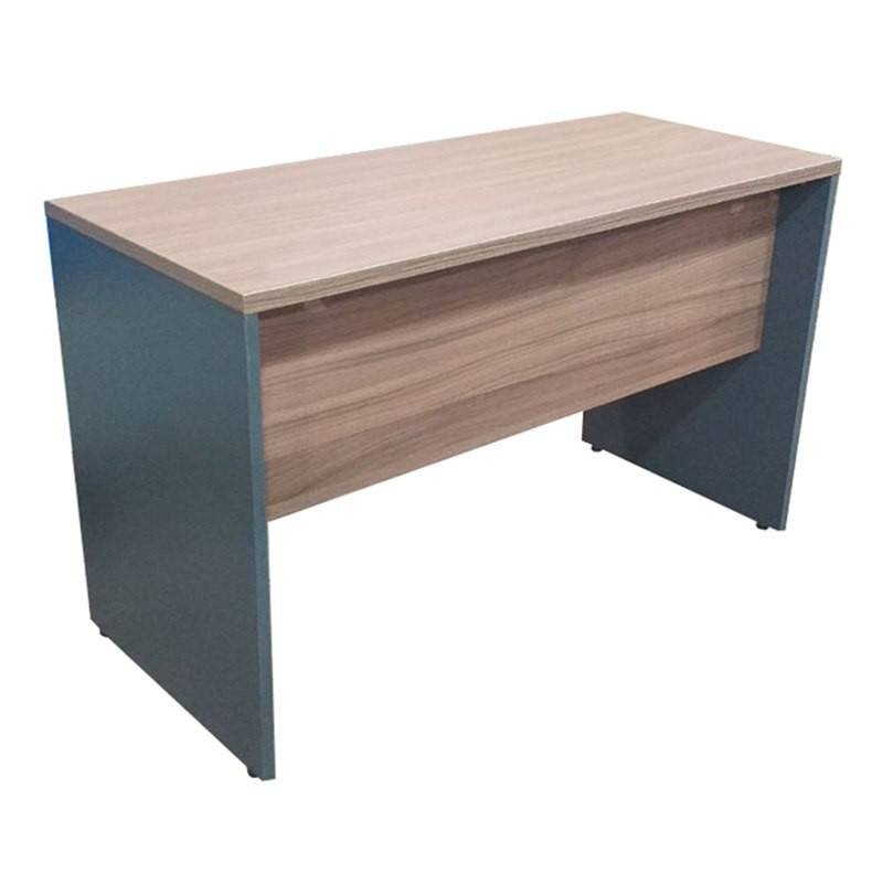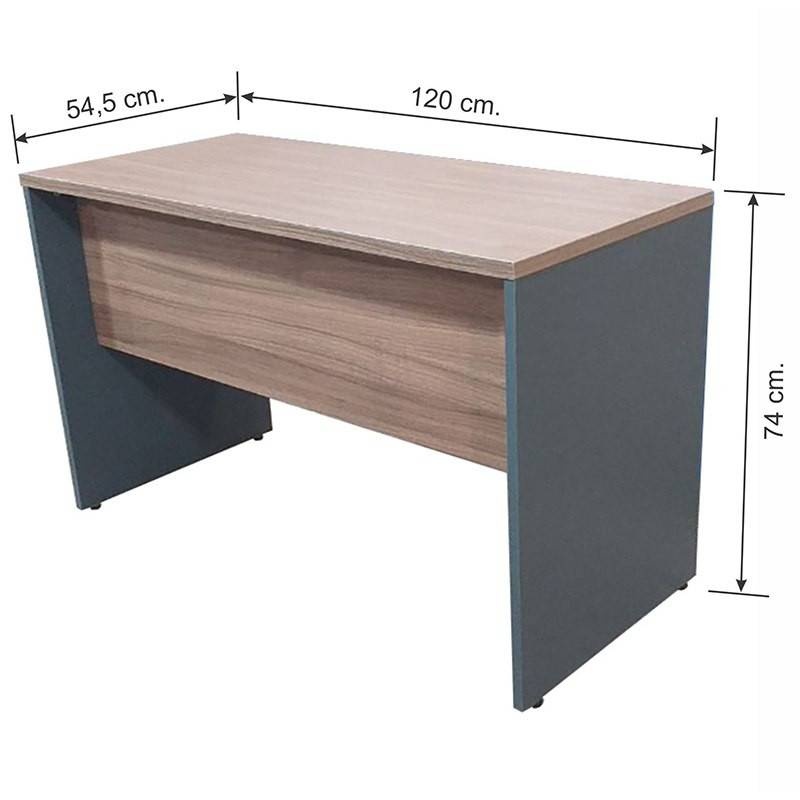 Escritorio fabricado en aglomerado melaminico, top en 25 mm color Carvalho mezzo, laterales de 18 mm de espesor en color grafito. Patines regulables. Incluye 2 bocas pasacable. Med. 120 cm de frente x 54,5 cm de prof. x 74 cm de altura