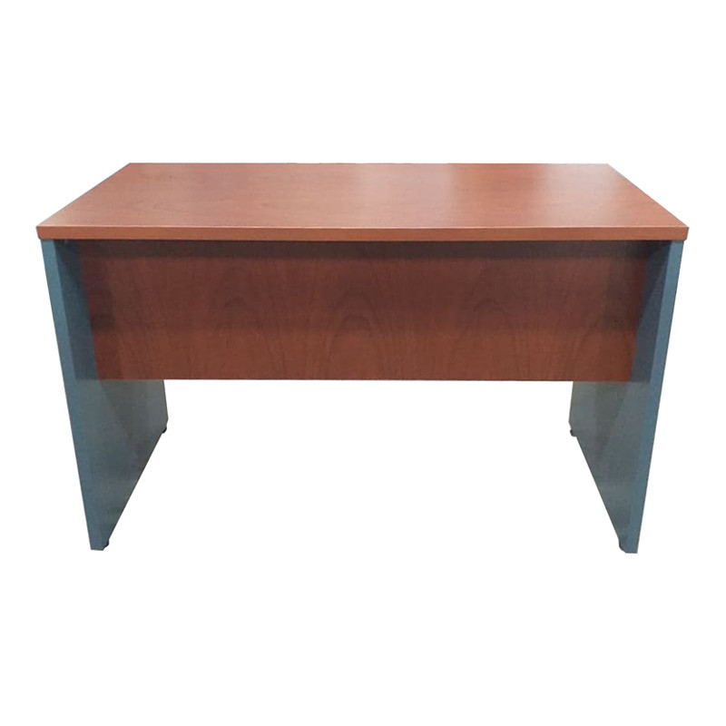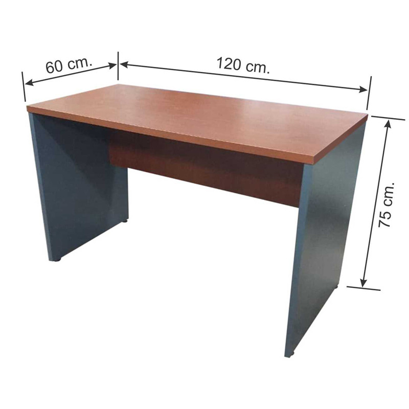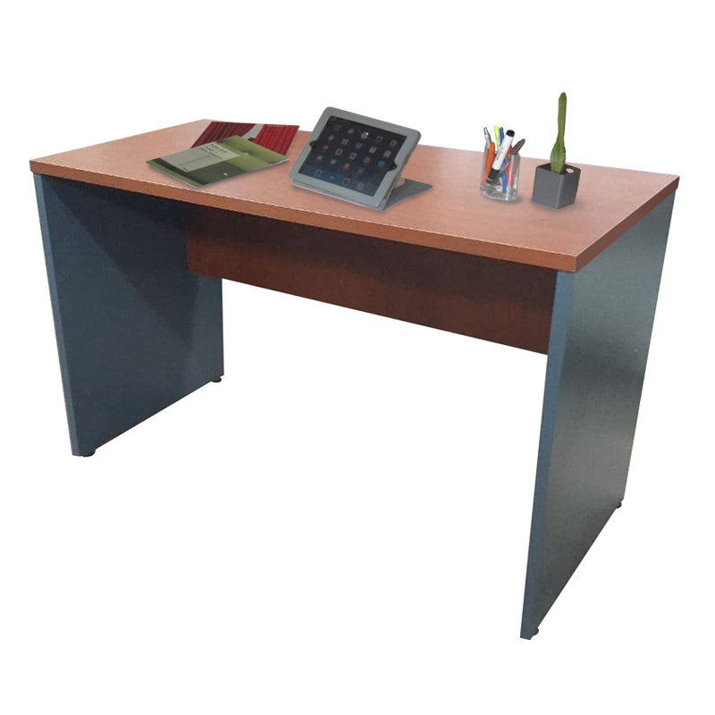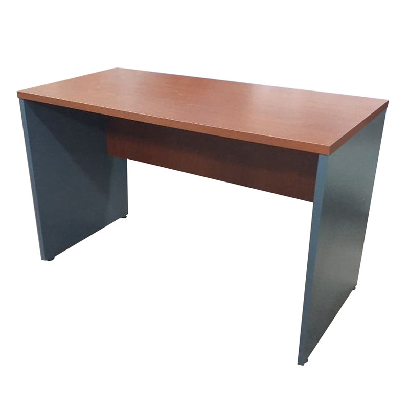 Escritorio fabricado en algomerado melaminico con top de 25 mm de espesor en color cedro, patas tipo panel en color grafito.
