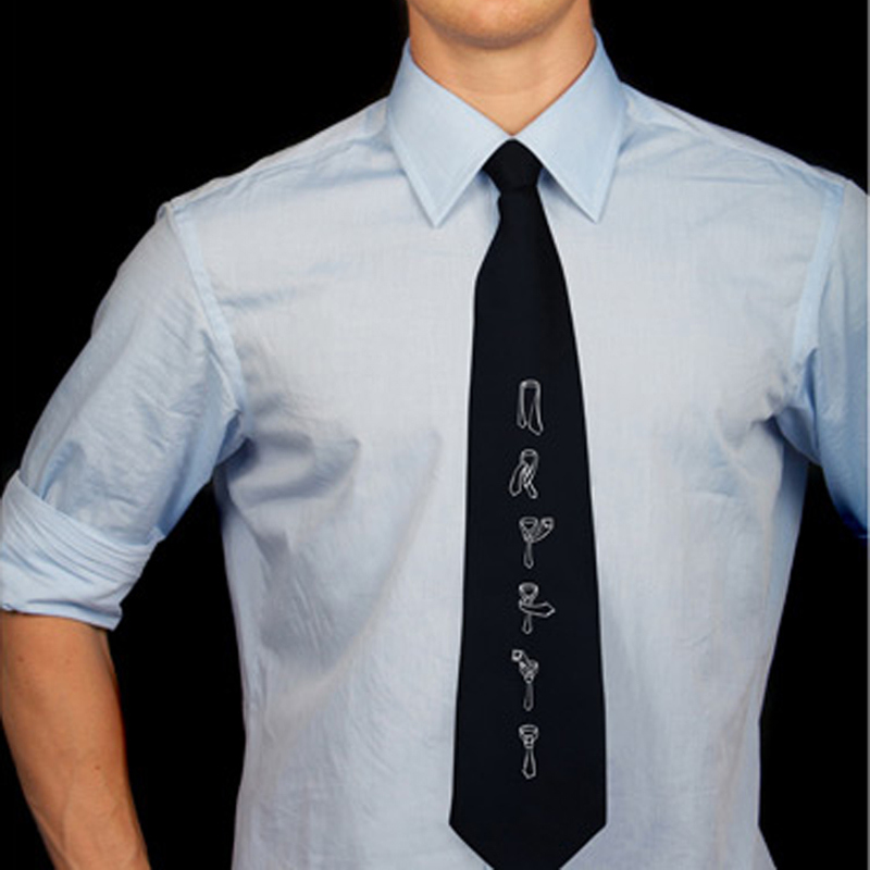 Corbata negra con instrucciones de anudado en la propia corbata.