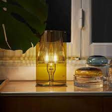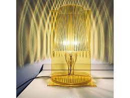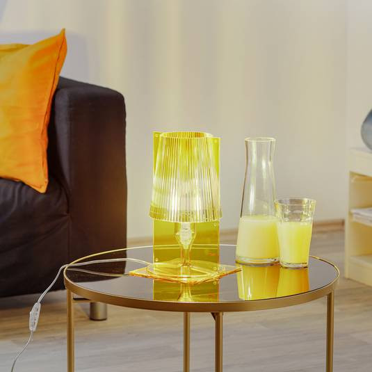 TAKE, diseñada por Ferruccio Laviani, es el ícono clásico de la lámpara sobre la mesita de luz, totalmente renovada. Lámpara creada con proceso de inyección en policarbonato transparente u opaco en diversas tonalidades cromáticas. Base simétrica con láminas planas y pantalla plisada. Color AMARILLO . Marca KARTELL - Producto original. Made in Italy.