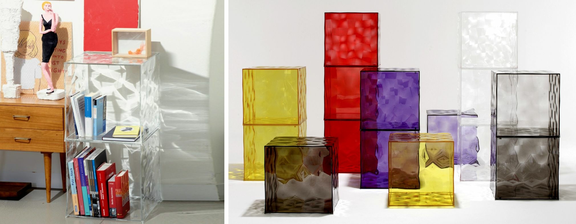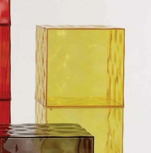 OPTIC, diseñado por Patrick Jouin, es un cubo contenedor de polimetacrilato de metilo disponible en dos versiones, cerrado con puerta o con una cara abierta, la superficie está decorada con pirámides de base cuadrada ligeramente en relieve que, con la superficie de espejo o transparente, crea un efecto óptico de gran impacto. Con medidas de 41 x 41 x 41 cm, ofrece infinitas posibilidades de combinación. Marca KARTELL. Made in Italy.