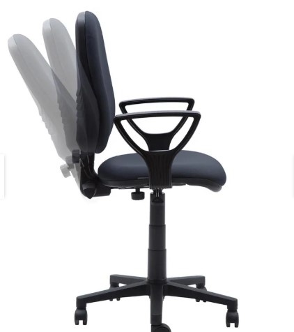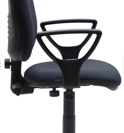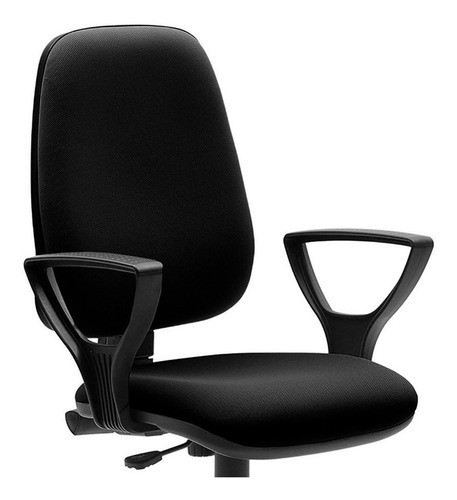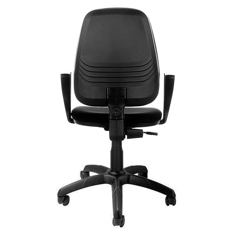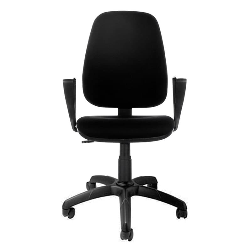 Silla Operativa Work. Respaldo alto. Traseras plásticas. Espuma de alta densidad y tapicería tejido color negro. Contacto permanente en el respaldo, ajustable. Regulable en altura por cilindro a gas. Base de poliamida reforzada con fibra de vidrio color negro con 5 ruedas dobles de 50 mm. Incluye par de apoyabrazos fijos.